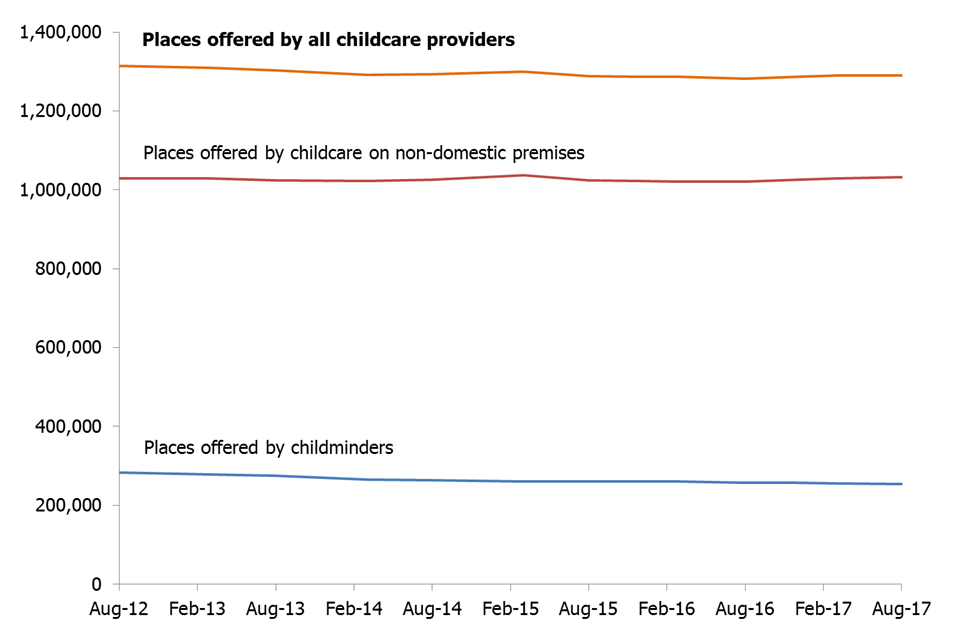 While the number of places offered by childminders has decreased and the number of places offered by non-domestic providers has increased slightly, the overall number of places offered by early years registered providers has remained fairly stable since August 2012.