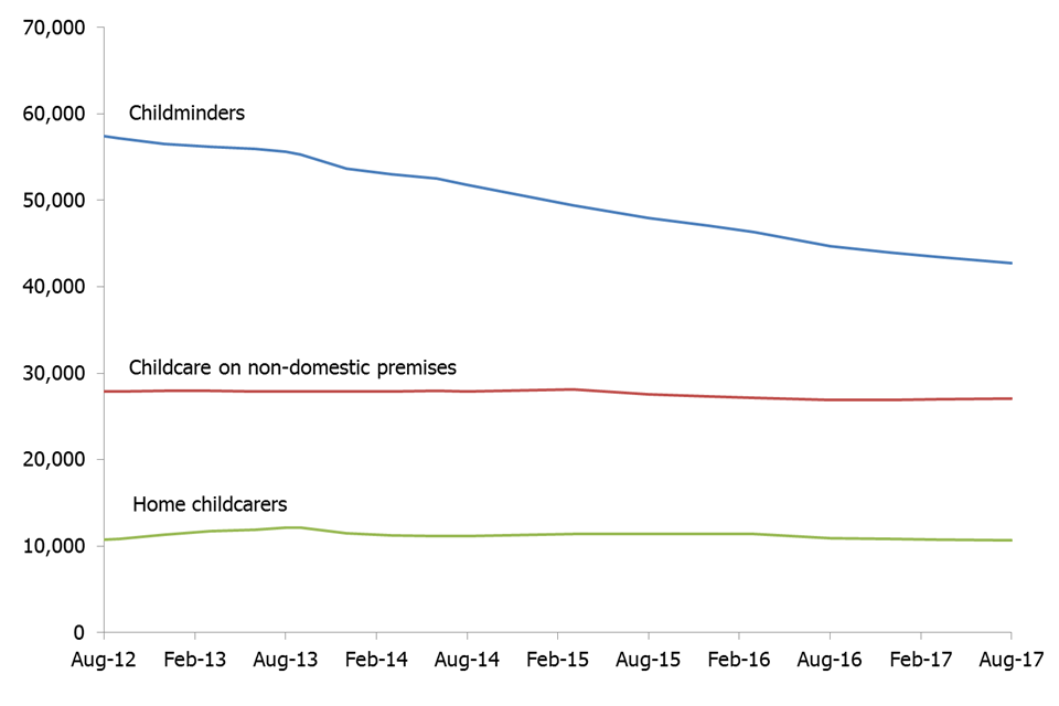 Overall, childcare provider numbers have decreased steadily since August 2012. This has been driven by a large decrease in childminders, a small decrease in non-domestic providers, and no notable change in the number of home childcarers (Figure 2).