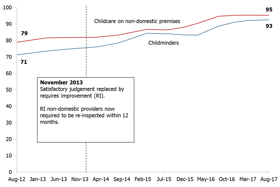 Over time, the proportion of childcare on non-domestic premises judged good or outstanding has seen a steady increase. Part of this increase can be attributed to a change in the childcare inspection policy. Since November 2013, all childcare on non-domestic premises judged requires improvement must be re-inspected within 12 months. This means that non-domestic providers have had more opportunity to demonstrate improvement than they did previously.
