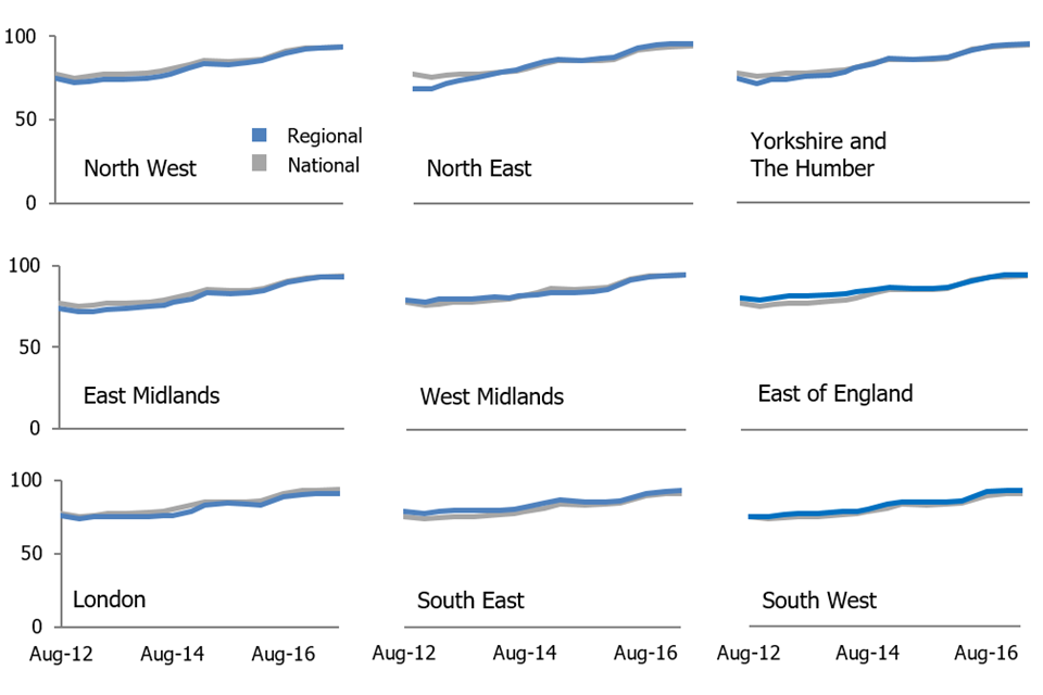 Figure 5: Percentage of providers judged good or outstanding from 31 August 2012 to 31 August 2017, by region