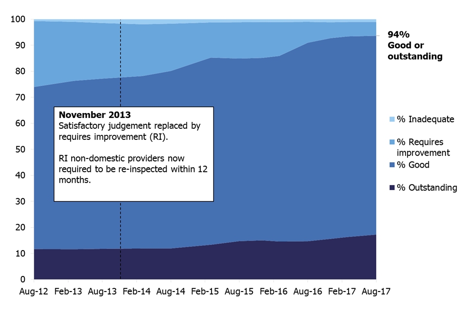 This chart shows that overall the percentage of childminders and non-domestic providers judged good or outstanding has increased substantially between August 2012 and August 2017.