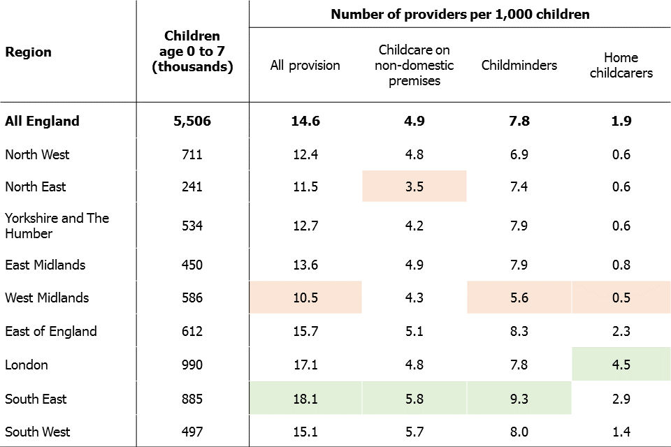 For childminders, the ratio of providers to children is also highest in the South East (9.3 per 1,000), and lowest in the West Midlands (5.6 per 1,000).