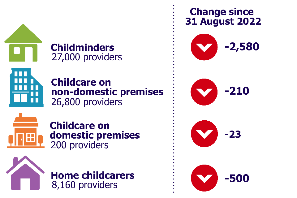 - There were 62,300 childcare providers registered with Ofsted, down by 3,320 (5%) since 31 August 2022. Most of this decline is due to a fall in the number of childminders.