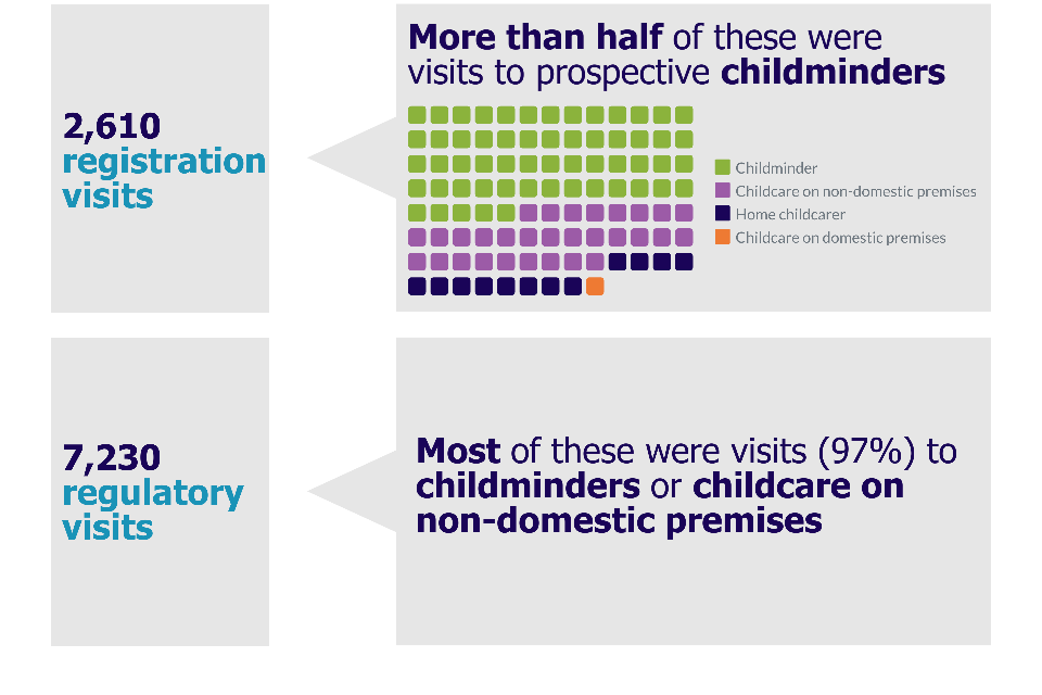 | Regulatory visits | 7,230 | Most of these visits (97%) were to childminders or childcare on non-domestic premises. |