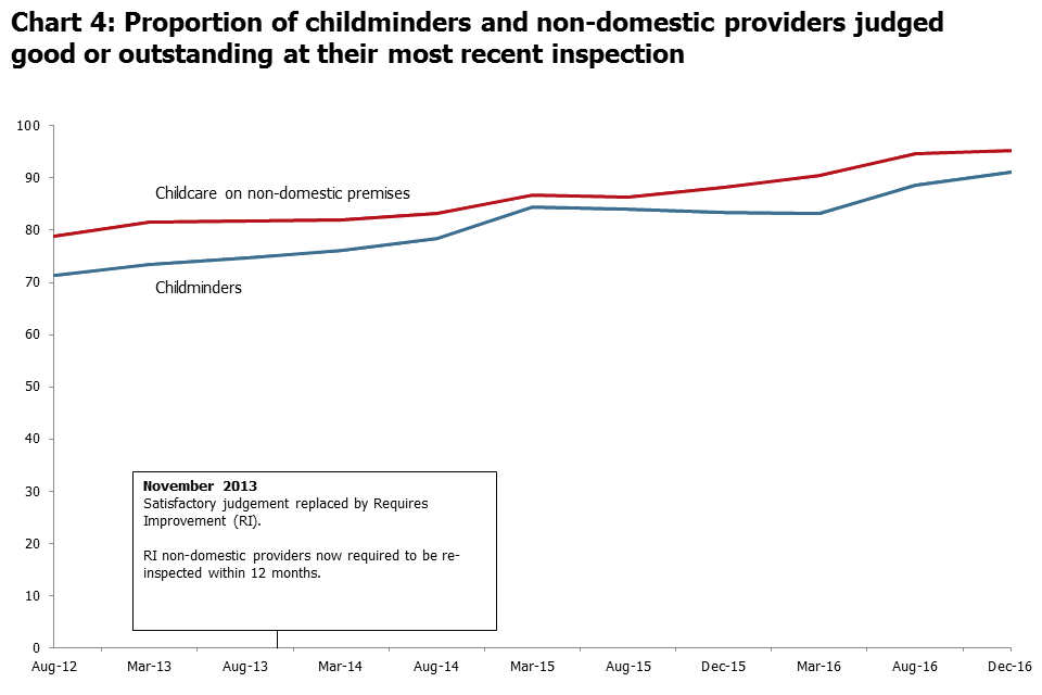 Since August 2012, the proportion of childcare on non-domestic premises judged good or outstanding has been increasing steadily. As with childminders, part of this increase can be explained by a change in the childcare inspection policy. From November 2013, all childcare on non-domestic premises judged requires improvement must be re-inspected within 12 months. See announcement of update in early years inspection policy from Her Majesty’s Chief Inspector in August 2013. This means that non-domestic providers have had more opportunity to demonstrate improvement than they did previously.