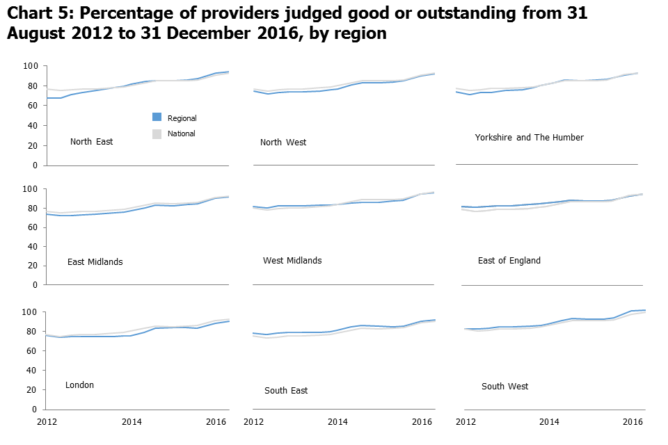 The rise in the proportion of providers judged good or outstanding over time is seen across all of the 9 regions in England (Chart 5).