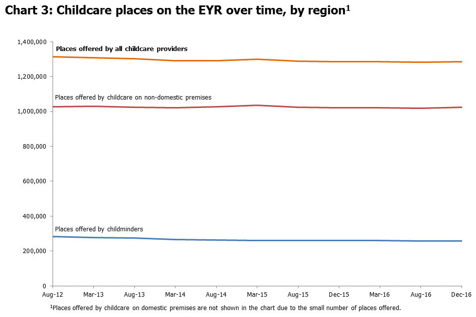 Despite decreasing numbers of providers on the EYR, the number of childcare places has remained broadly stable since August 2012. In the last 4 months, while childminder places have decreased, there has been a slight increase in the number of places overall due to a rise in places offered by childcare on non-domestic premises. There are currently almost 1.3 million places on offer.