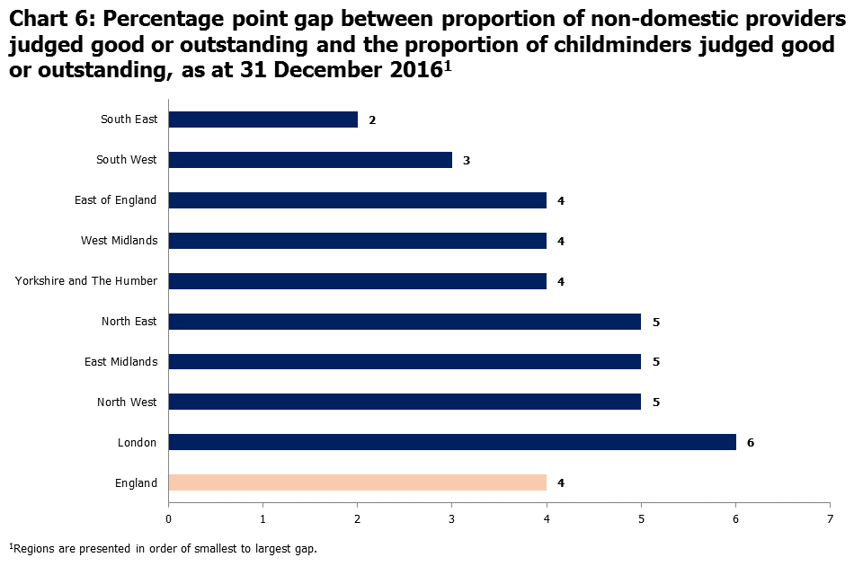 There is more regional variation in the inspection outcomes of childminders than non-domestic providers. Therefore, regional differences in the gap between the proportion of childminders and non-domestic premises judged good or outstanding are primarily driven by the proportion of childminders judged good or outstanding.