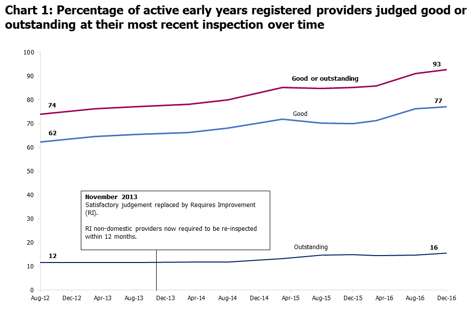 As at 31 December 2016, the proportion of childcare providers on the EYR judged to be good or outstanding was 93% (Chart 1). This is up from 91% since 31 August 2016 and up from 74% since 31 August 2012. This rise is mostly due to an increase in the proportion of providers judged good.