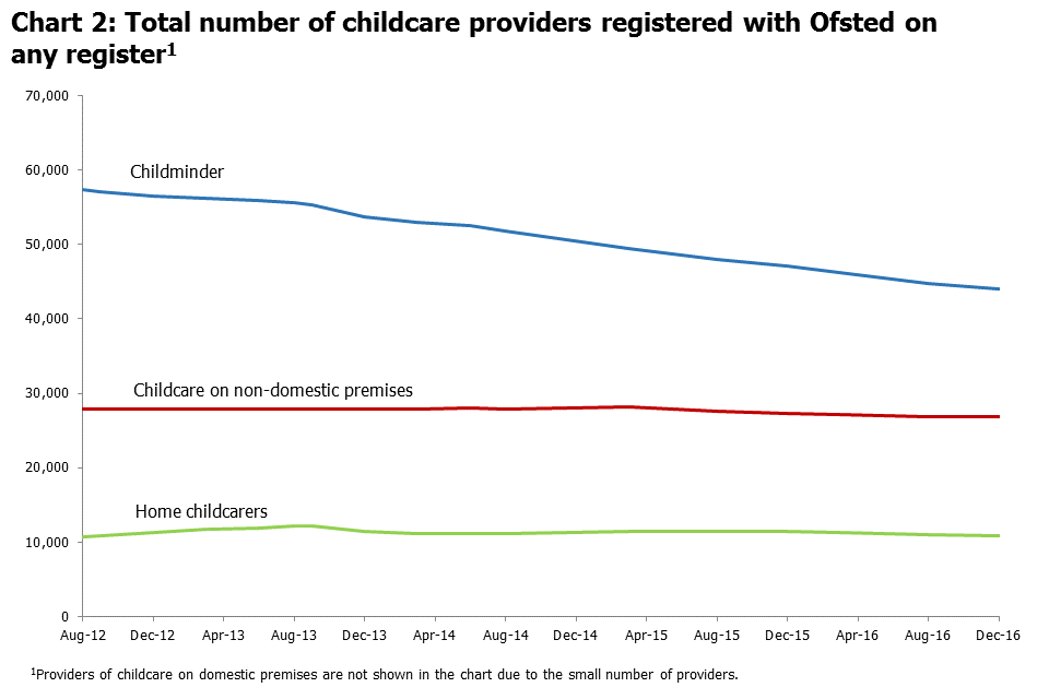 There were 44,000 childminders registered with Ofsted as at 31 December 2016, down 700 from 31 August 2016. Overall, childminder numbers have fallen by 23% since 31 August 2012. The number of non-domestic providers has remained stable at 26,900 over the last 4 months, but is down 3% since 31 August 2012.