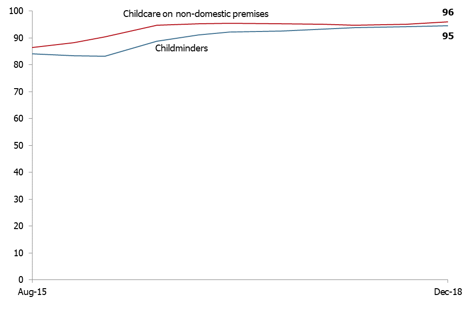 At their most recent inspection, 96% were good or outstanding, an increase of one percentage point since August 2018. This was made up of 73% of childcare on non-domestic premises judged good and 24% outstanding.