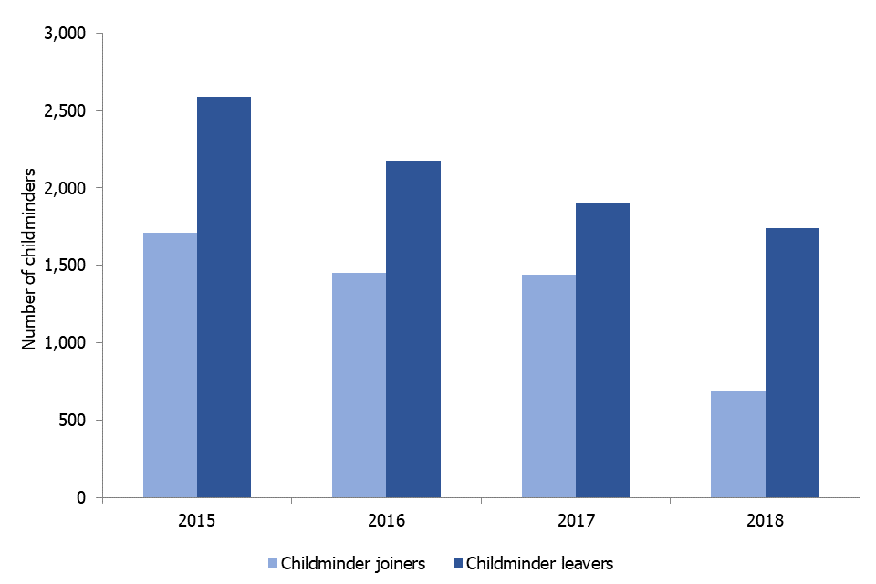 Since the previous official statistics (31 August 2018), 1,700 childminders have left the sector and 700 joined – a net decrease of 1,000[footnote 1]. The childminders who left the register during this period had been registered for around 9 years on average (based on the assumption that the exact date they left the register was 31 December 2018).