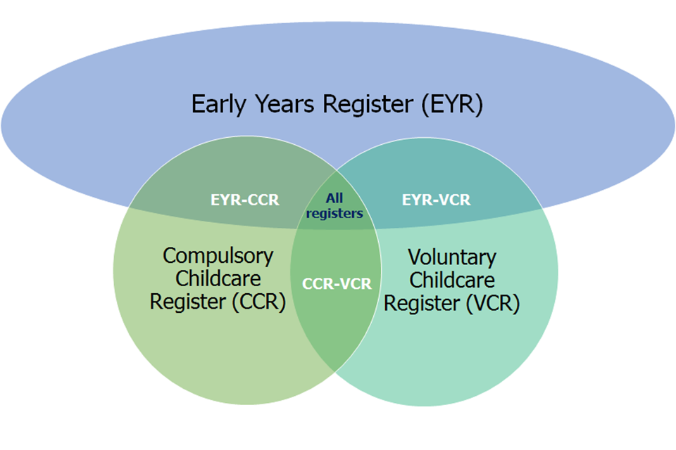 This Venn diagram shows that providers can be on the Early Years Register (EYR), Compulsory Childcare Register (CCR), Voluntary Childcare Register (VCR) or a combination of two or three of the registers.