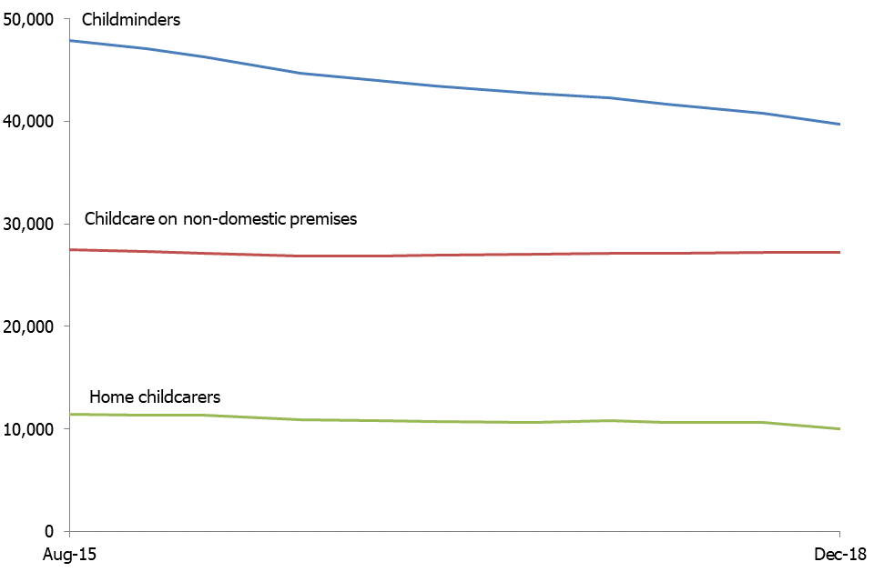 10,000 providers on 31 December 2018, down by 600 since 31 August 2018. Although numbers of home childcarers have fluctuated over time, they are now 12% lower than they were on 31 August 2015.