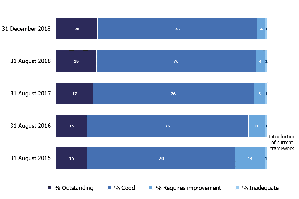 On 31 December 2018, 95% of childcare providers on the EYR were judged either good or outstanding at their most recent inspection. This has not changed since 31 August 2018, but is a substantial increase from 31 August 2015 when the proportion was 85% (Figure 1).