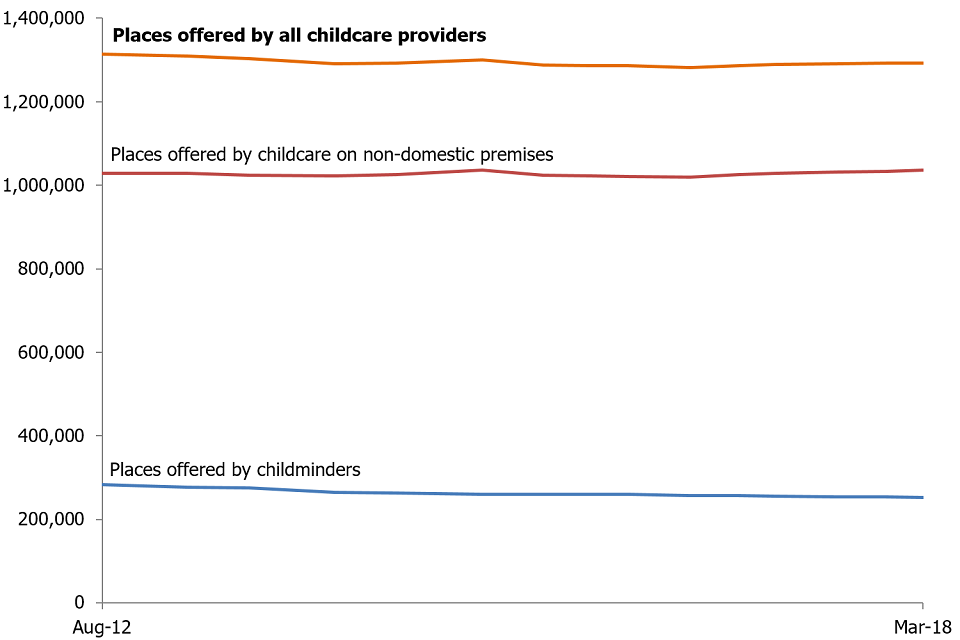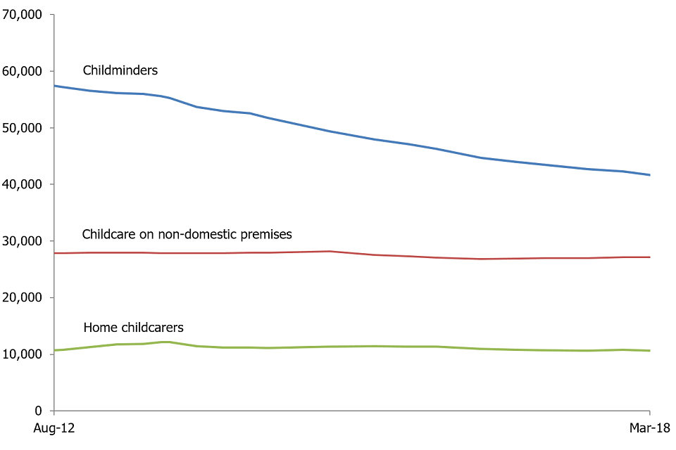 The number of providers of childcare on non-domestic premises and home childcarers has remained fairly stable over time, whereas the number of childminders has decreased significantly between August 2012 and March 2018.