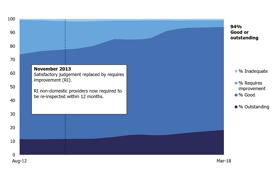 In August 2012, the proportion of providers judged good or outstanding was 74% and by March 2018, this had risen to 94%.