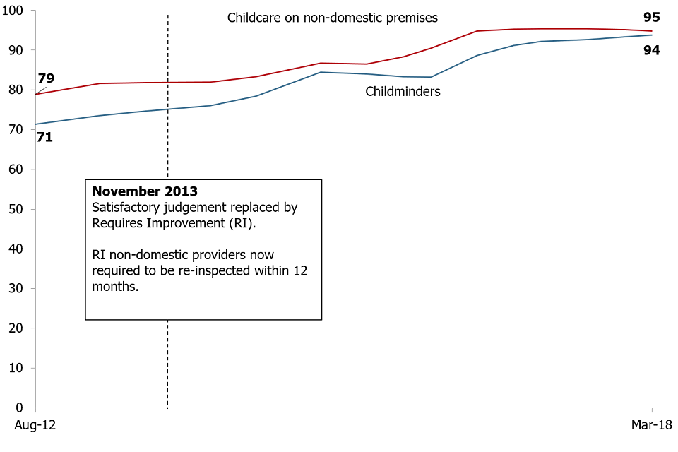 Over time, the proportion of childcare on non-domestic premises judged good or outstanding has seen a steady increase. Part of this increase can be attributed to a change in the childcare inspection policy. Since November 2013, all childcare on non-domestic premises judged requires improvement must be re-inspected within 12 months. This means that non-domestic providers have had more opportunity to demonstrate improvement than they did previously.