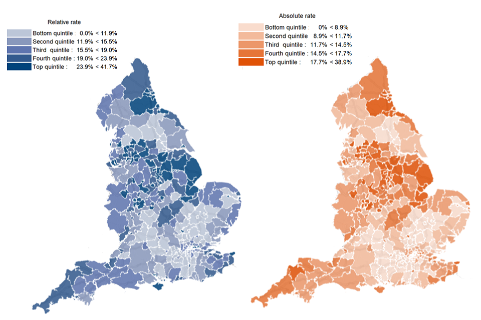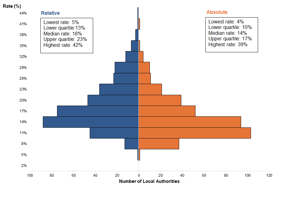 | Local Authority | Relative - proportion of children (%) | Absolute - proportion of children (%) |