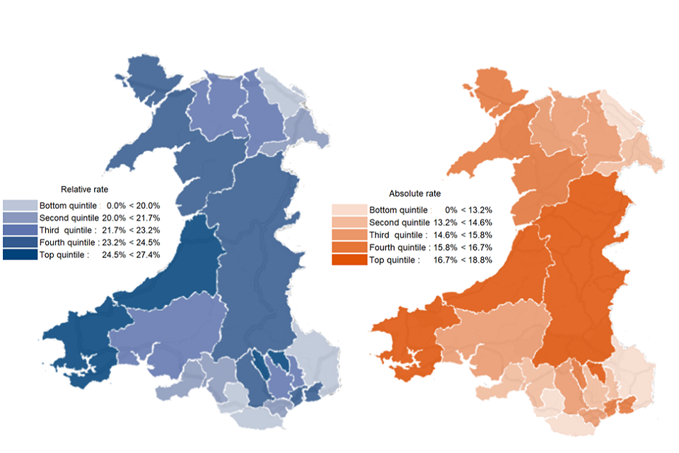 Proportion of children aged under 16 in Relative and Absolute low income families by local authority (quintiles), Wales, financial year ending 2022