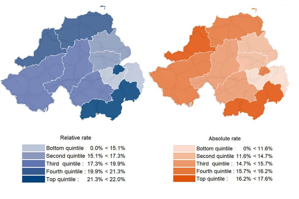 Proportion of children aged under 16 in Relative and Absolute low income families by local authority (quintiles), Northern Ireland, financial year ending 2022