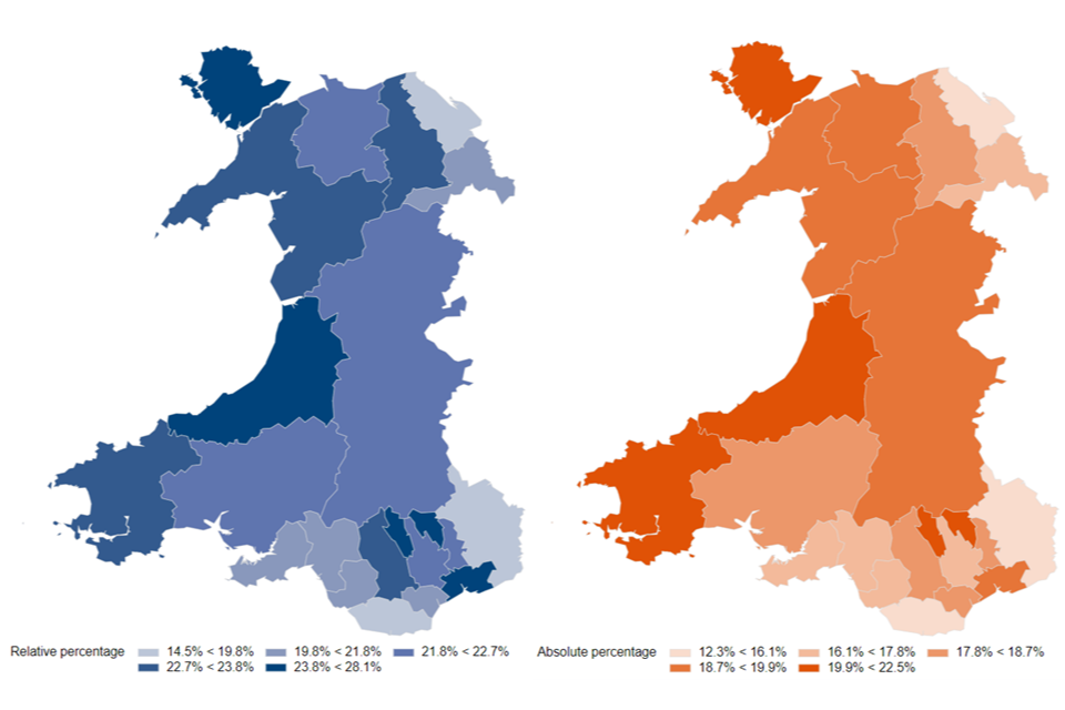 Monmouthshire was the local authority in Wales with the lowest proportion of children aged under 16 for both Relative and Absolute measures at 15% and 12% respectively.