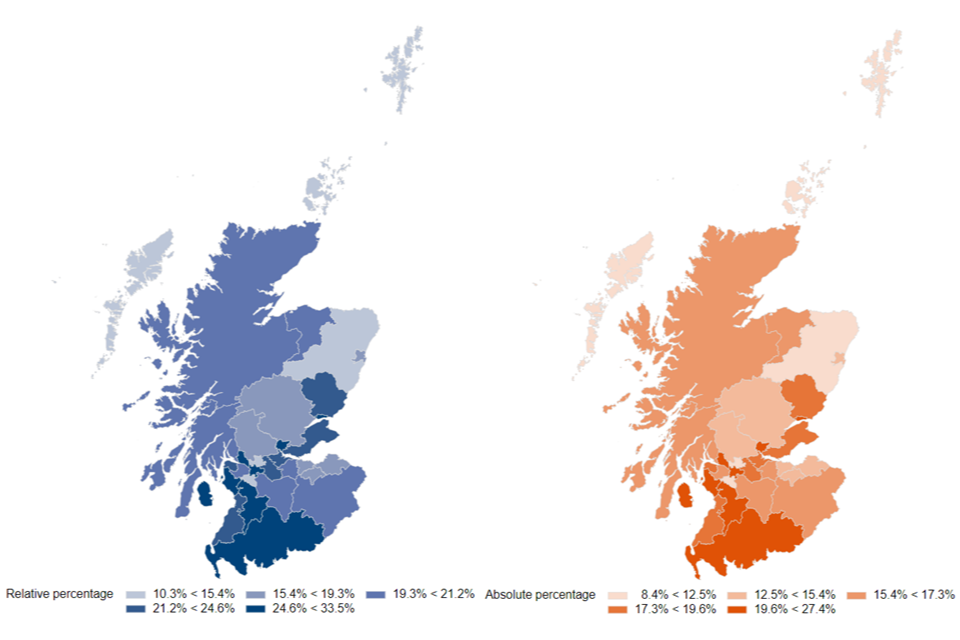 Proportion of children aged under 16 in Relative and Absolute low income families by local authority (quintiles), Scotland, financial year ending 2023