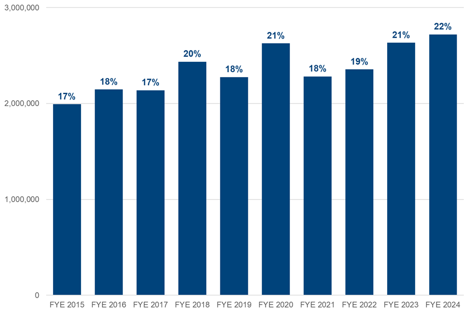 In the FYE 2024, the proportion of children aged under 16 in Relative low income families was 22%, an increase of one percentage point on the previous year and an increase of four percentage points from FYE 2019.