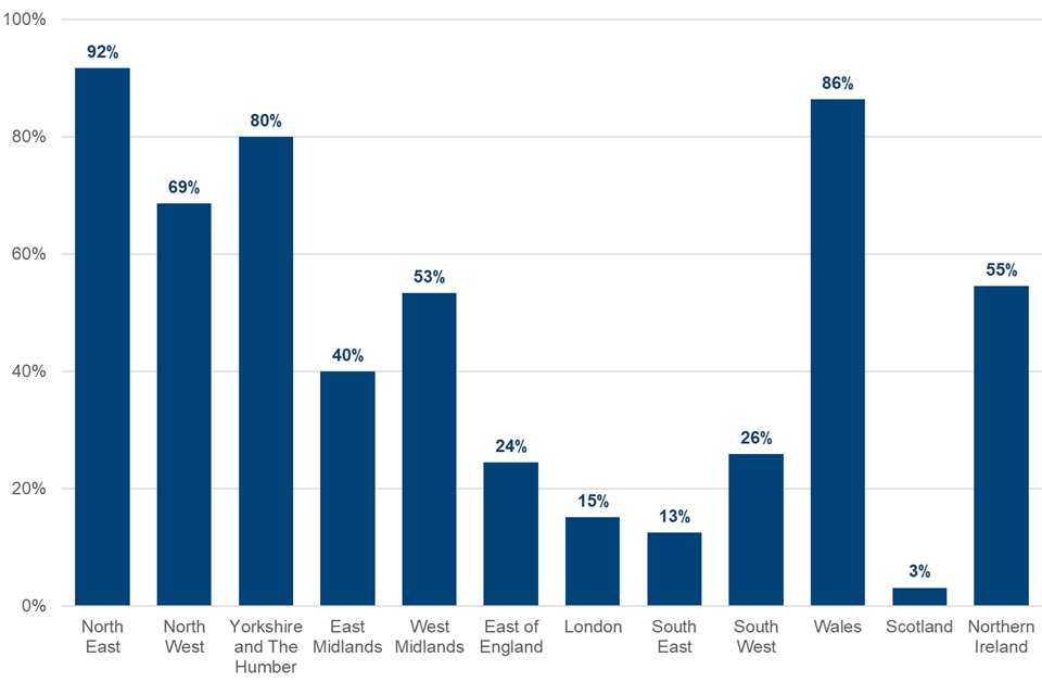 Percentage of Local Authorities where the proportion of children in Low Income families is greater than the United Kingdom average, by region, FYE 2024