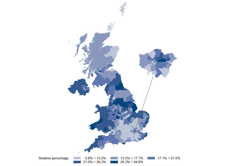 | Uttlesford | East of England | 1,634 | 9.1% |