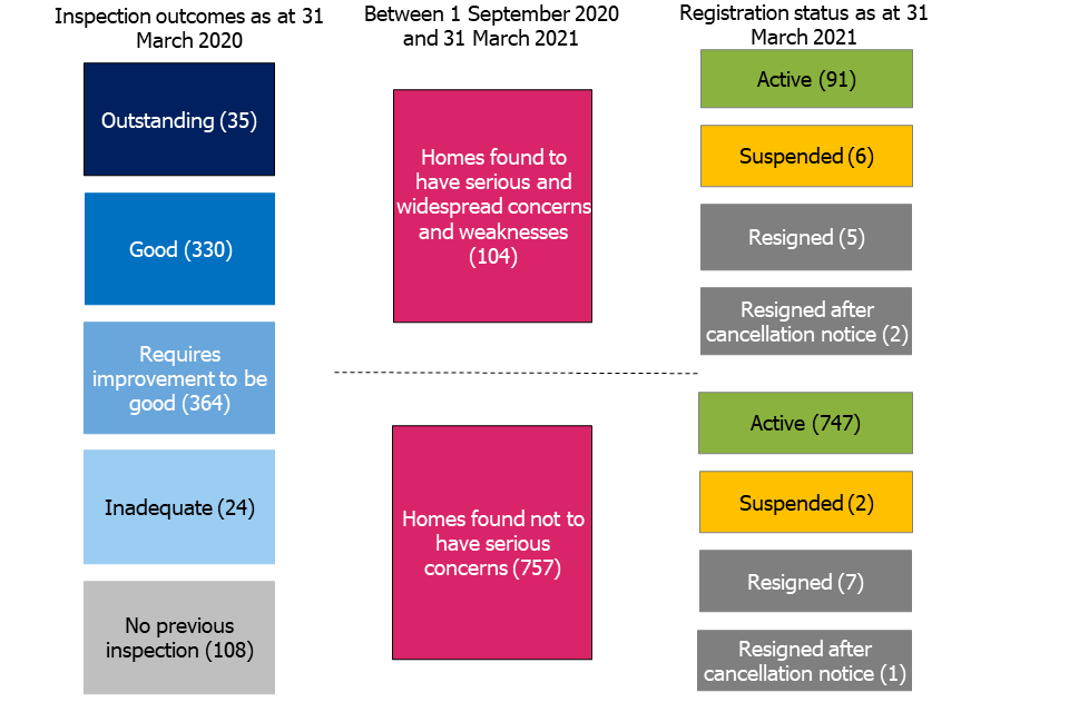 | Registration status as at 31 March 2021 | Homes found to have serious and widespread concerns and weaknesses (104) |