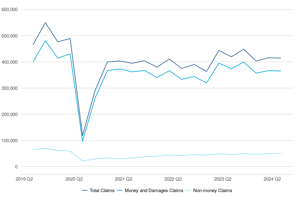 Money claims were down 3% (to 342,000 claims) in April to June 2024 compared to the same quarter in 2023.