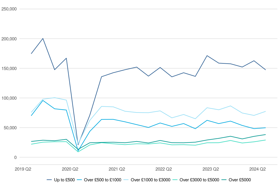The decrease in money claims is driven by claims valued under £500 and claims between £500 and £1,000. These were down 7% and 12% to 147,000 and 50,000 claims respectively in the period April to June 2024 compared to the same quarter in 2023.