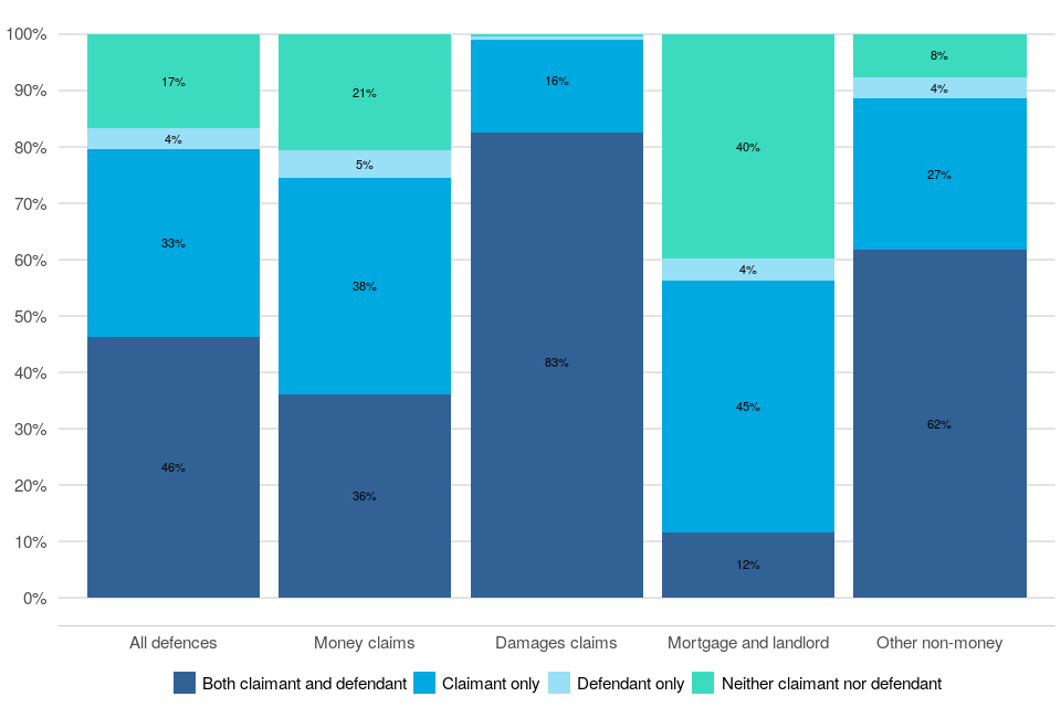 Of those claims defended in April to June 2024, 46% had legal representation for both claimant and defendant, 33% had representation for claimant only, and 4% for defendant only. Most (83%) damages claim defences had legal representation for both the defendant and claimant, compared with 36% of money claim defences.