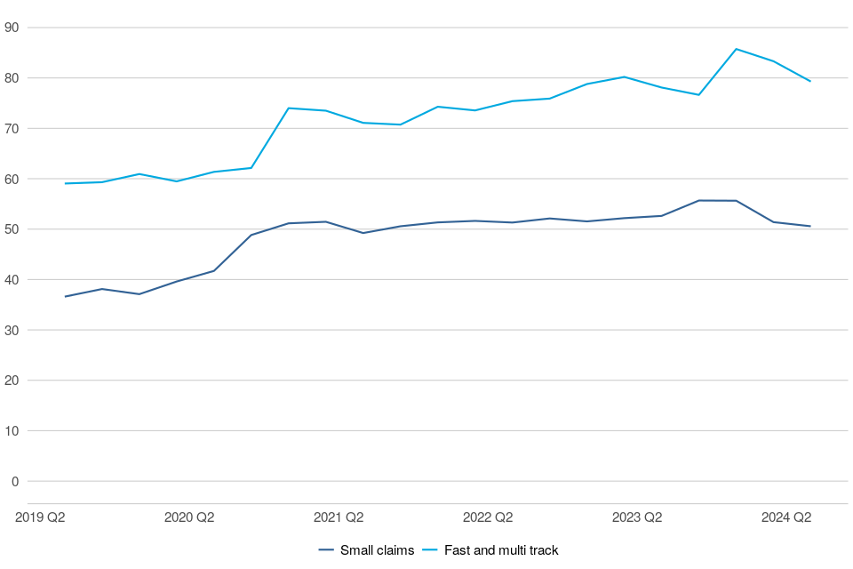Average time taken for small claims was 50.6 weeks (2.0 weeks less compared to the same quarter in 2023) and for multi and fast track claims it was 79.3 weeks (1.2 weeks longer than April to June 2023).