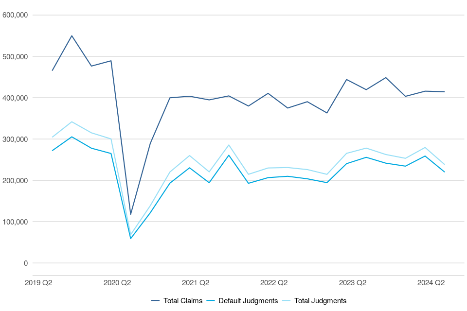 Figure 5: All claims, judgments and default judgments, Q2 (April to June) 2019 to Q2 (April to June) 2024 (Source: tables 1.2 and 1.4)