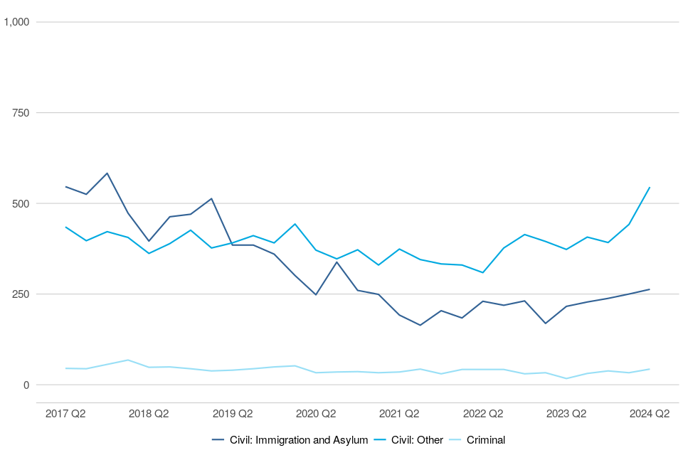 Of the 850 applications received in Q2 2024, 260 were civil immigration and asylum applications, 550 were civil (other), and 43 were criminal, up 22%, 46% and 153% respectively on Q2 2023. None of the civil immigration and asylum cases have since been transferred to the UTIAC.