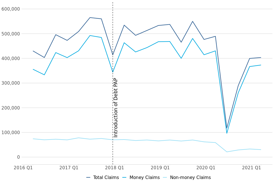 Specified money claims were down 15% (to 340,000 claims) in January to March 2021 compared to the same quarter in 2020, driving the overall trend in money claims.