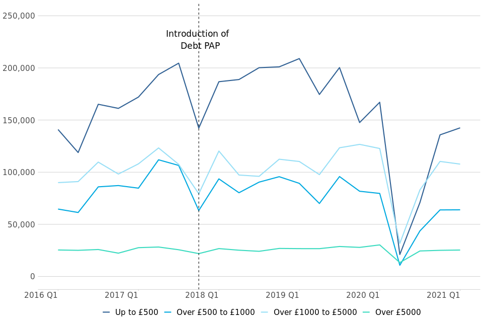 The only increase in claim volumes was in “other” unspecified money claims (up 135% on the same quarter in 2020). As noted last quarter, this increase is as a result of PPI-related claims that rely on a section of the Consumer Credit Act that relates to unfair relationships and follows a series of court rulings on the matter.