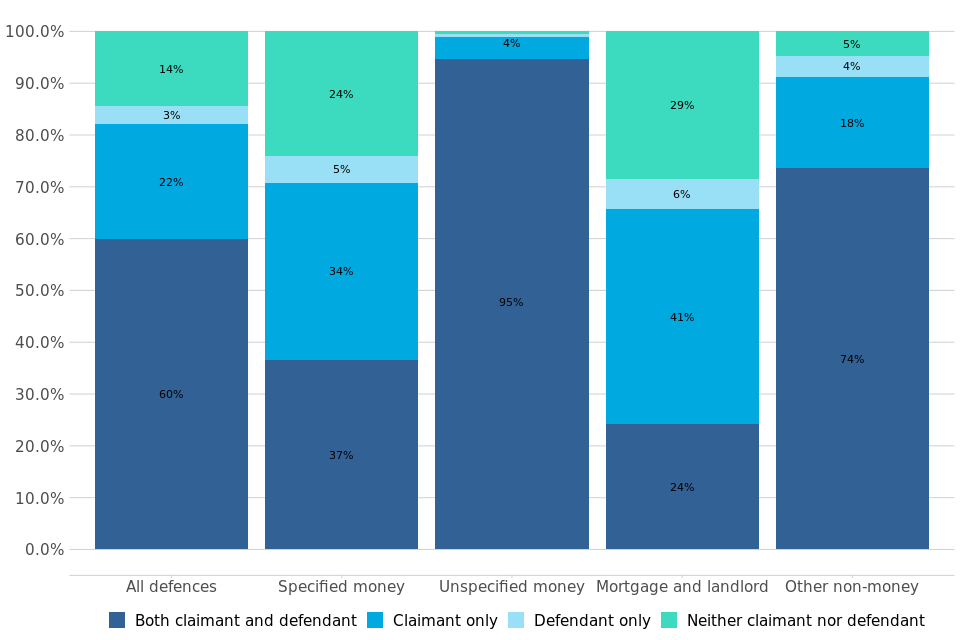 Of those claims defended in January to March 2021, 60% had legal representation for both claimant and defendant, 22% had representation for claimant only, and 3% for defendant only. Almost all (95%) unspecified money defences had legal representation for both the defendant and claimant, compared with 37% of specified money defences.