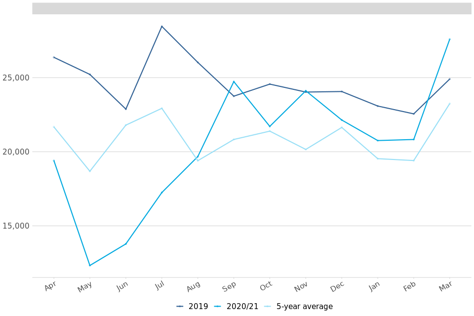 This recovery continued in Q4 2020 and Q1 2021 but has not been steady until the last two months. The most recent monthly figures (21,000, 21,000 and 28,000 defended claims for January, February and March respectively) have started to show a return to pre-Covid levels. For example, February was up 7% on the 5-year average and down 8% on the higher volumes seen in 2019, and December was up 2% on the 5-year average and down 8% on 2019.