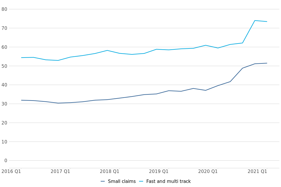 Average time taken for small claims was 51.5 weeks (11.9 weeks longer compared to the same quarter in 2020) and for multi and fast track claims it was 73.4 weeks (14.0 weeks longer than January to March in 2020).
