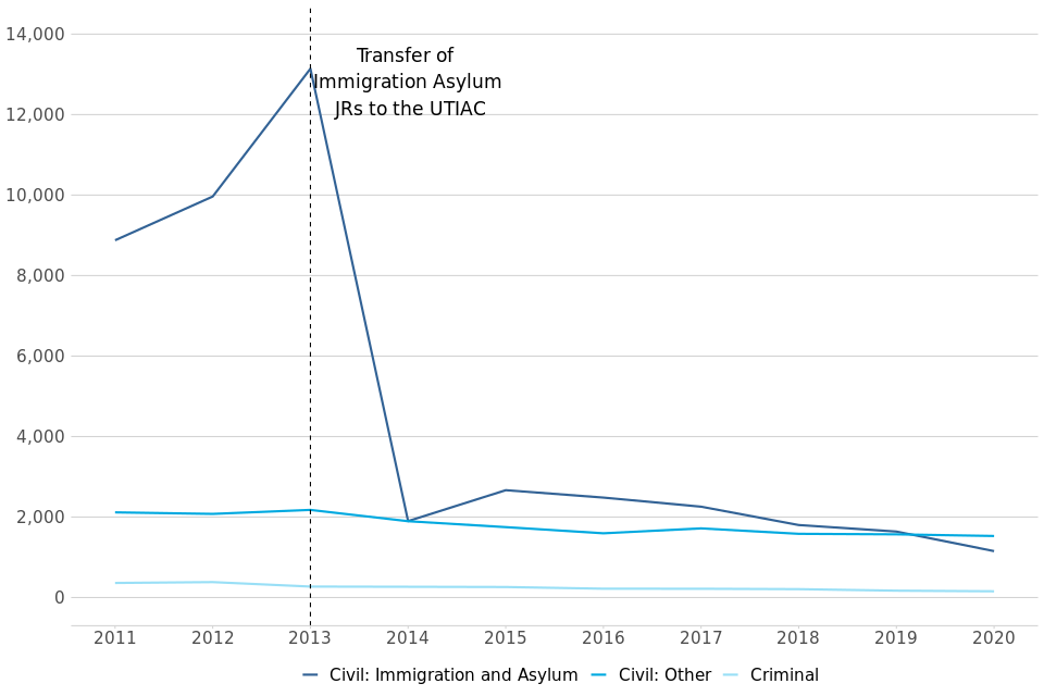 A more granular view of the JR data by department and case type can be found in the newly developed data visualisation tool found here. Feedback is welcome on this tool to ensure it meets user needs.