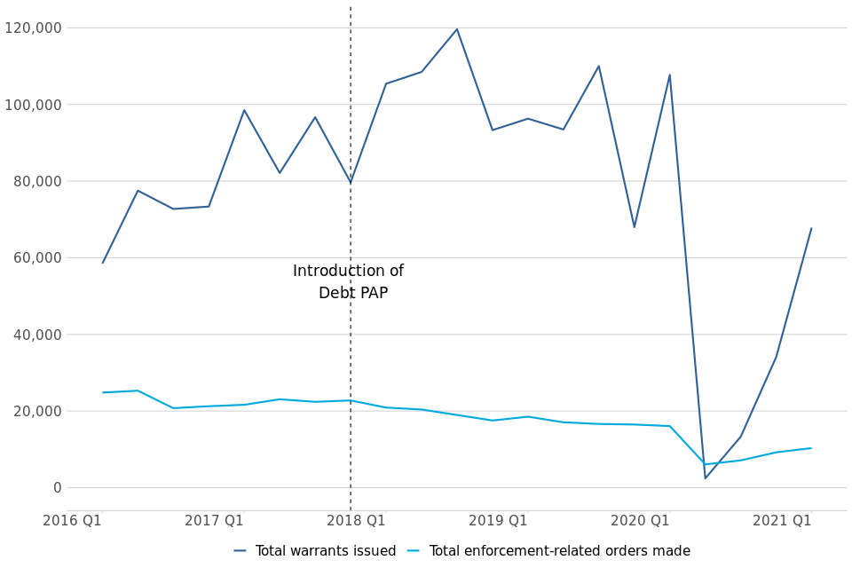 Figure 8: Warrants and enforcements issued – Q1 (January to March) 2016 to Q1 (January to March) 2021 (Source: tables 1.7 and 1.8)