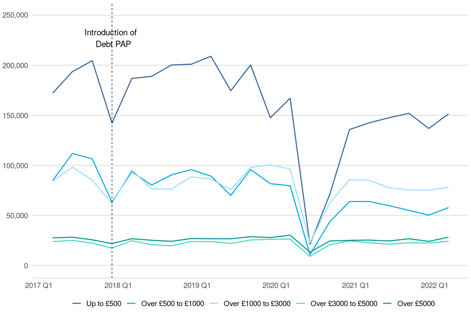 Figure 2: Money claims by monetary value, Q1 (January to March) 2017 to Q1 (January to March) 2022 (Source: civil workload CSV[footnote 2])