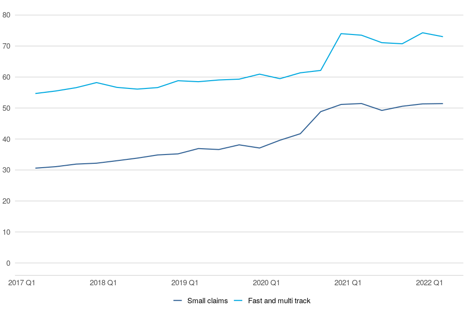 | Mean time taken from claim to hearing has increased | The mean time taken for small claims and multi/fast track claims to go to trial was 51.4 weeks and 73.0 weeks, 14.5 weeks longer than the same period in 2019 for both. These measures remained stable for small claims and multi/fast track claims compared to the same quarter in 2021. |