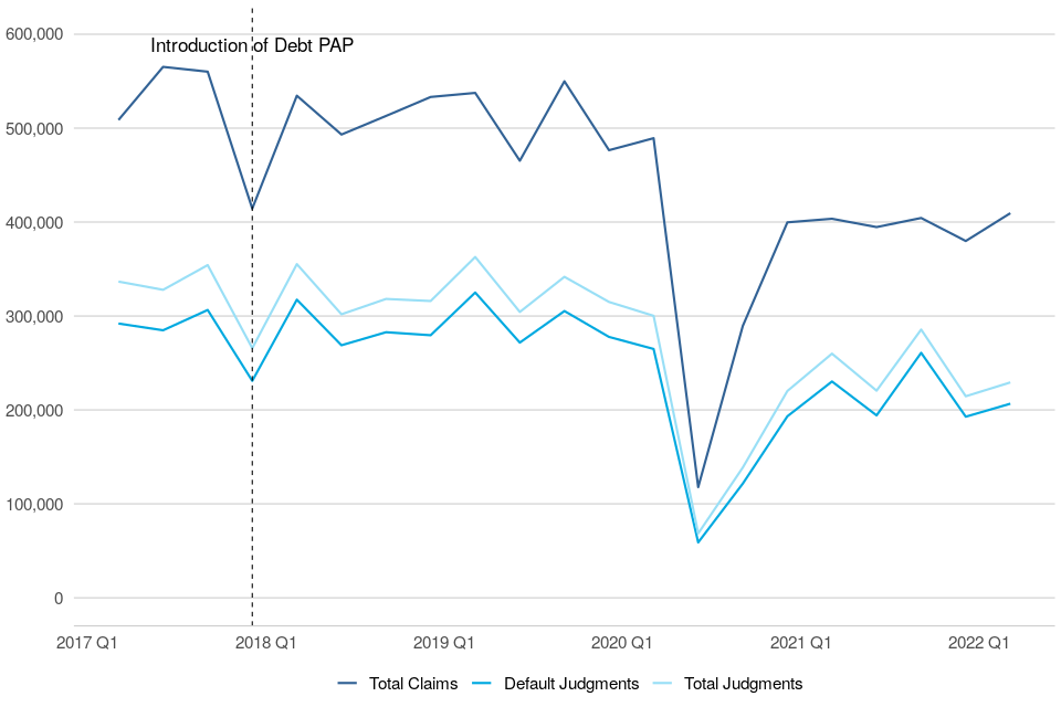 There were 229,000 judgments made in January to March 2022, compared to 363,000 in the same quarter of 2019. Of these judgments, 207,000 (90%) were default judgments.
