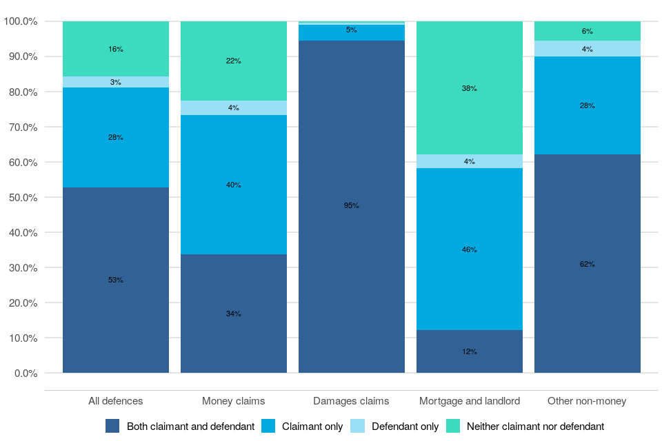 Of those claims defended in January to March 2022, 53% had legal representation for both claimant and defendant, 28% had representation for claimant only, and 3% for defendant only. Almost all (95%) damages claim defences had legal representation for both the defendant and claimant, compared with 34% of money claim defences.