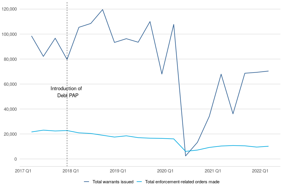 Figure 6: Warrants and enforcements issued – Q1 (January to March) 2017 to Q1 (January to March) 2022 (Source: tables 1.7 and 1.8)