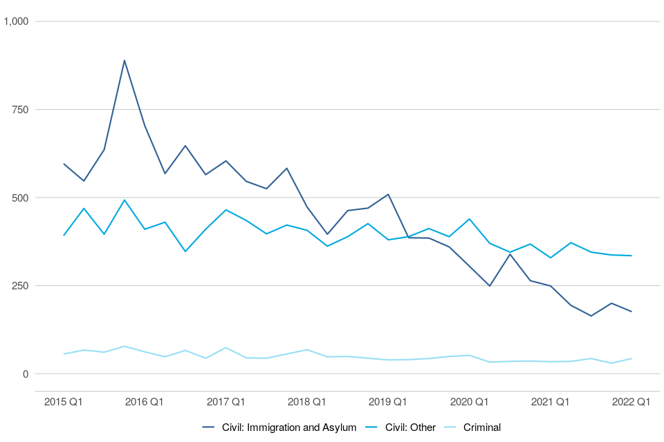 Of the 550 applications received in Q1 2022, 180 were civil immigration and asylum applications, 340 were civil (other), and 43 were criminal, down 29%, up 2% and up 26% respectively on Q1 2021. 7 of the civil immigration and asylum cases have since been transferred to the UTIAC.
